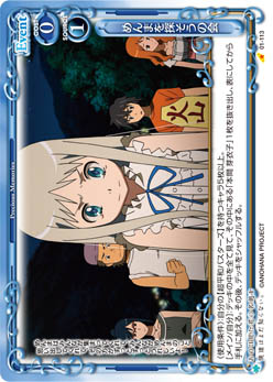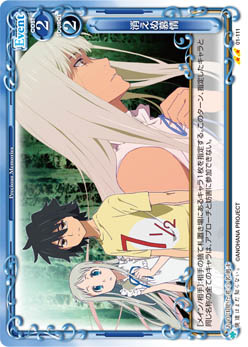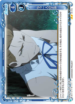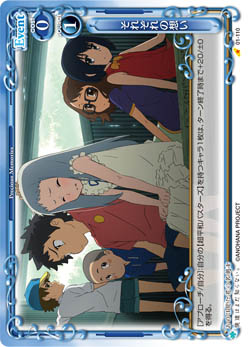 | [メイン/自分]:自分の『あの日見た花の名前を僕達はまだ知らない。』のキャラ1枚を指定する。その場合、手札から指定したキャラと同じ名称のキャラ1枚を休息状態で場に出す。 | ||