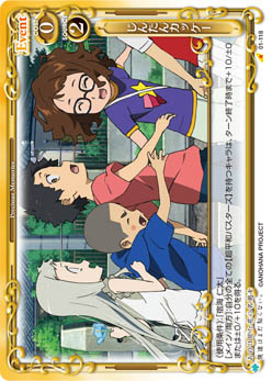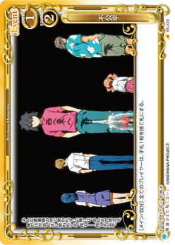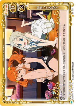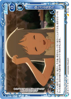| [メイン/相手]:カードを1枚引く。その後、相手はカードを1枚引くことができる。相手がカードを引いた場合、自分の捨て札置き場にあるキャラ1枚を手札に戻す。 | ||