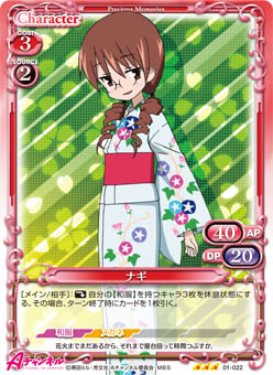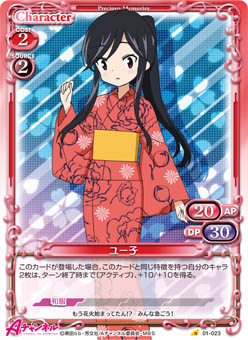| [メイン/相手]:《休》自分の【和服】を持つキャラ3枚を休息状態にする。その場合、ターン終了時にカードを1枚引く。 | ||