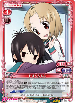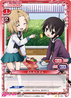 | このカードが登場した場合、自分の捨て札置き場にある「るん」1枚を手札に戻すことができる。このカードのアプローチで相手のキャラが退場した場合、自分の捨て札置き場にあるキャラ1枚を手札に戻すことができる。 | ||