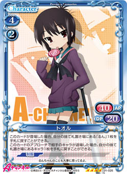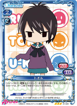 | [メイン/自分]:《0》このカードのAP/DPの値を、ターン終了時まで自分の『Aチャンネル』のキャラ1枚のAP/DPと同じ値に変更する。 | ||