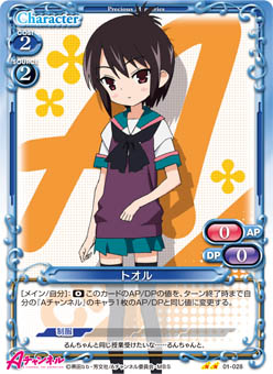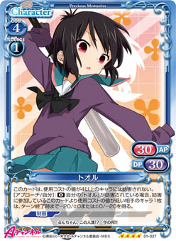 | このカードは、使用コストの値が4以上のキャラには妨害されない。[アプローチ/自分]:《0》自分の「トオル」が妨害されている場合、妨害に参加しているこのカードより使用コストの値が低い相手のキャラ1枚は、ターン終了時まで-20/±0または±0/-20を得る。 | ||