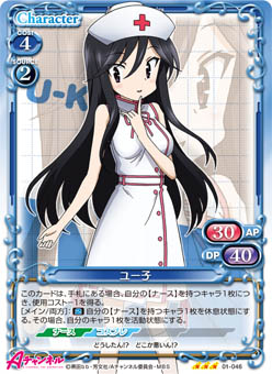 | このカードは、手札にある場合、自分の【ナース】を持つキャラ1枚につき、使用コスト-1を得る。[メイン/両方]:《青2》自分の【ナース】を持つキャラ1枚を休息状態にする。その場合、自分のキャラ1枚を活動状態にする。 | ||