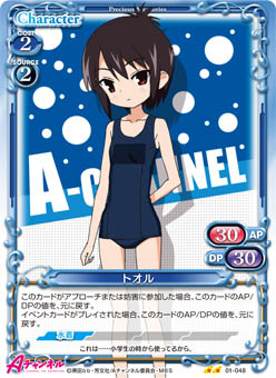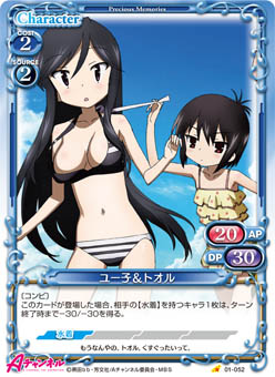 | 〔コンビ〕このカードが登場した場合、相手の【水着】を持つキャラ1枚は、ターン終了時まで-30/-30を得る。 | ||