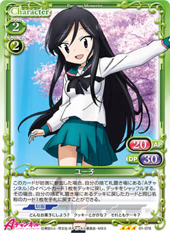 | このカードが登場した場合、自分のポイント置き場にある『Aチャンネル』のキャラ1枚を手札に戻す。その場合、手札1枚を表向きで自分のポイント置き場に置く。 | ||