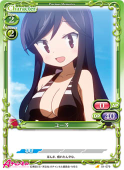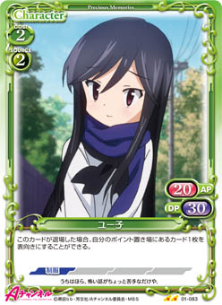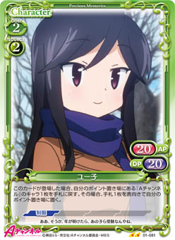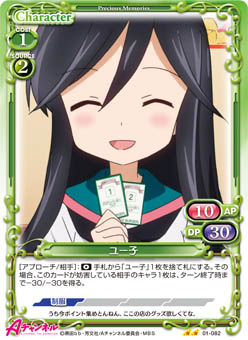 | このカードが登場した場合、自分のポイント置き場にある「ユー子」1枚を表向きにすることができる。[アプローチ/相手]:《0》手札から「ユー子」1枚を捨て札にする。その場合、自分のキャラ1枚を活動状態にする。 | ||