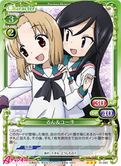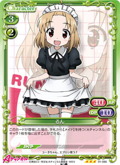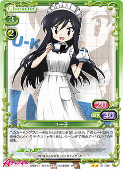 | このカードが登場した場合、手札から【メイド】を持つ『Aチャンネル』のキャラ1枚を場に出すことができる。 | ||