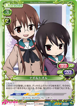 | 〔コンビ〕このカードは、「ナギ」または「ユー子」のコストとして使用する場合、発生コスト+2を得る。 | ||