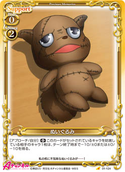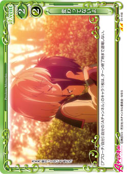 | [アプローチ/自分]:自分の『Aチャンネル』のキャラ1枚は、ターン終了時まで退場しない。 | ||