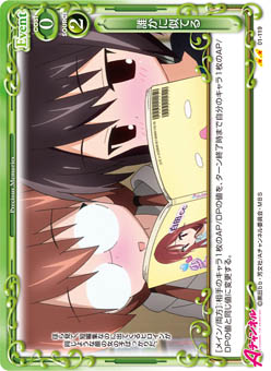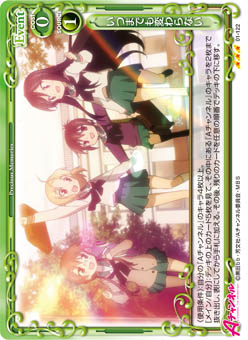 | 《使用条件》:自分の『Aチャンネル』のキャラ4枚以上。[メイン/自分]:デッキの上のカード5枚を見て、その中にある『Aチャンネル』のキャラを2枚まで抜き出し、表にしてから手札に加える。その後、残りのカードを任意の順番でデッキの下に移す。 | ||