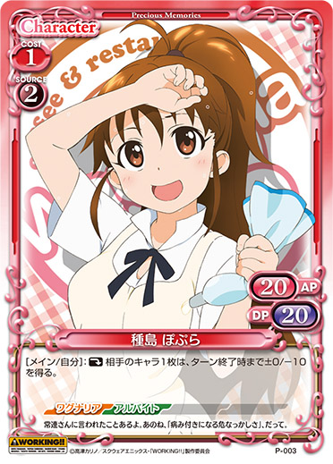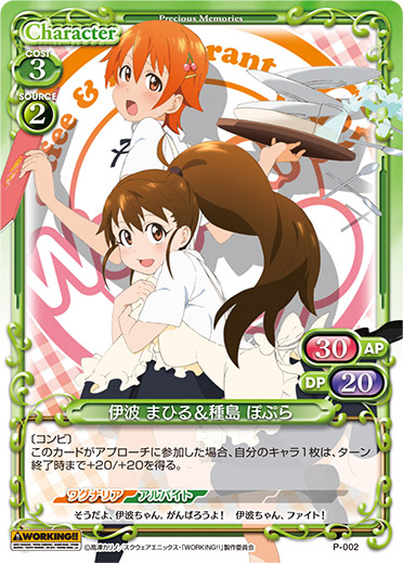 | 〔コンビ〕このカードがアプローチに参加した場合、自分のキャラ1枚は、ターン終了時まで+20/+20を得る。 | ||