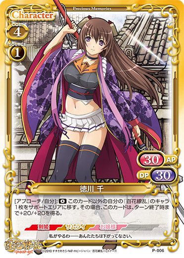 | [アプローチ/自分]:《0》このカード以外の自分の『百花繚乱』のキャラ1枚をサポートエリアに移す。その場合このカードは、ターン終了時まで+20/+20を得る。 | ||