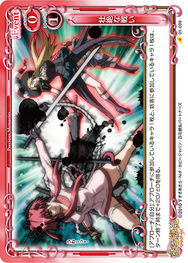 | [アプローチ/自分]:アプローチに参加しているキャラ1枚と、妨害に参加しているキャラ1枚は、ターン終了時まで+20/±0を得る。 | ||