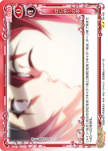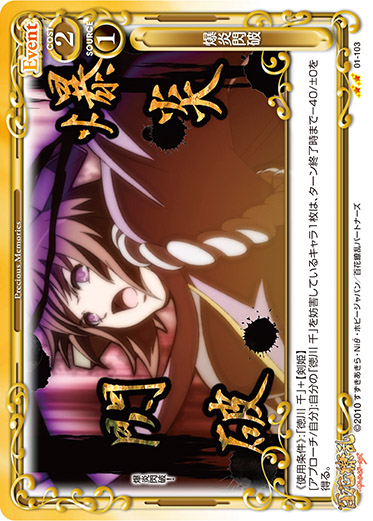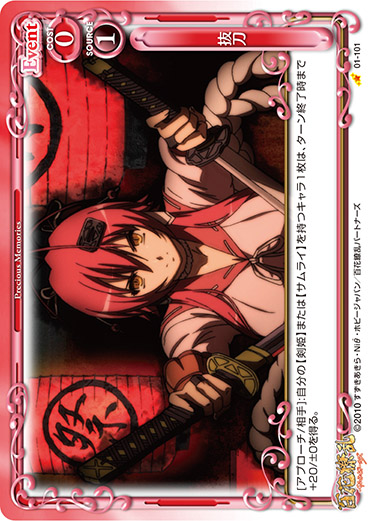 | [アプローチ/相手]:自分の【剣姫】または【サムライ】を持つキャラ1枚は、ターン終了時まで+20/±0を得る。 | ||