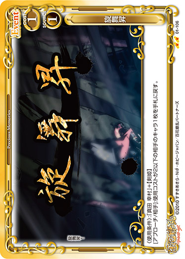 | 《使用条件》:「真田 幸村」+【剣姫】[アプローチ/相手]:使用コストが2以下の相手のキャラ1枚を手札に戻す。 | ||