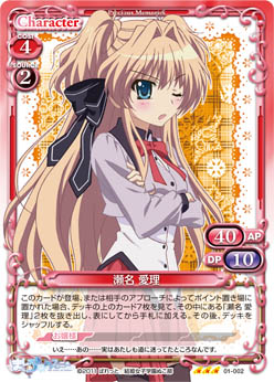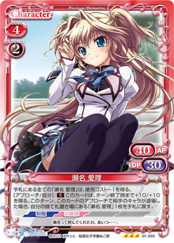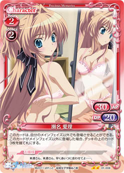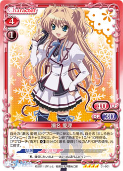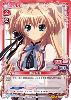 | このカードは、「瀬名 愛理」のコストとして使用する場合、発生コスト+1を得る。 | ||