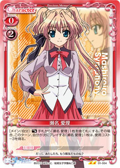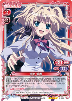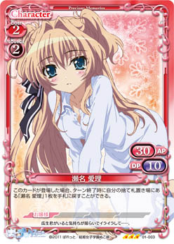 | [メイン/自分]:《休》手札から「瀬名 愛理」1枚を捨て札にする。その場合、このターン、自分が次にプレイする「瀬名 愛理」1枚は、使用コスト-3を得る。 | ||