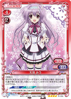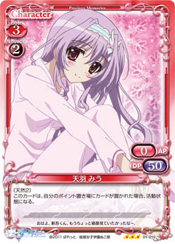 | 〔天然2〕自分の「天羽 みう」がアプローチでポイントを与えた場合、自分の捨て札置き場にある『ましろ色シンフォニー』のキャラ1枚を手札に戻すことができる。 | ||
