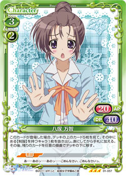 | このカードが登場した場合、自分の捨て札置き場にあるキャラを15枚までデッキに戻し、デッキをシャッフルする。 | ||
