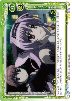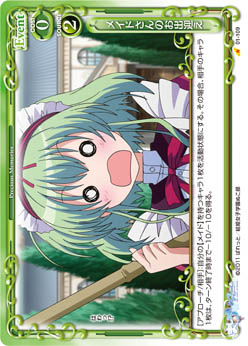 | 《使用条件》:【メイド】[アプローチ/両方]:自分のキャラ1枚を活動状態にする。その場合、ターン終了時に自分のポイント置き場にあるカード1枚を表向きにすることができる。 | ||