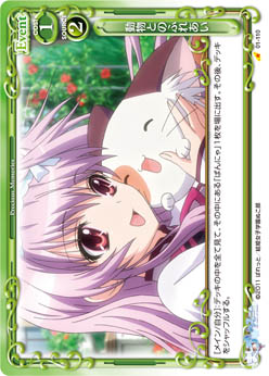 | [メイン/自分]:デッキの上のカード10枚を見て、その中にある【ぬこ部】を持つキャラ1枚を抜き出し、表にしてから手札に加える。その後、デッキをシャッフルする。 | ||