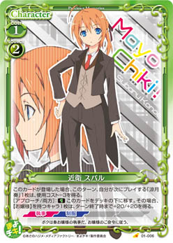 | このカードは、手札にある状態で自分の「近衛 スバル」がいる場合、自分のメインフェイズ以外でも登場させることができる。このカードが登場した場合、アプローチに参加している自分のキャラ1枚を手札に戻す。または、自分のキャラ1枚を活動状態にする。 | ||