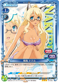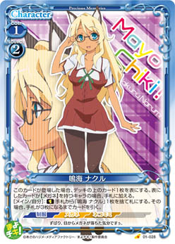 | このカードが登場した場合、デッキの上のカード1枚を表にする。表にしたカードが【メガネ】を持つキャラの場合、手札に加える。[メイン/自分]:《黄1》手札から「鳴海 ナクル」1枚を捨て札にする。その場合、手札が3枚になるまでカードを引く。 | ||