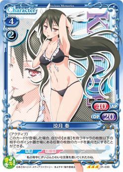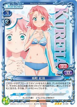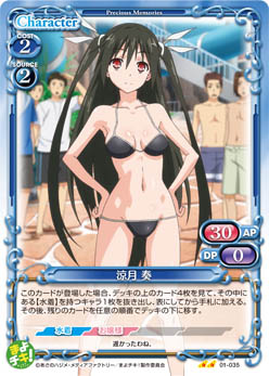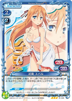 | このカードがアプローチでポイントを与えた場合、デッキの中を全て見て、その中にある【水着】を持つキャラ1枚を抜き出し、表にしてから手札に加える。その後、デッキをシャッフルする。 | ||