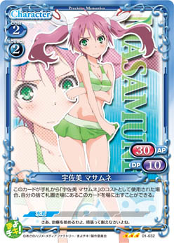 | このカードが手札から「宇佐美 マサムネ」のコストとして使用された場合、自分の捨て札置き場にあるこのカードを場に出すことができる。 | ||