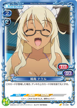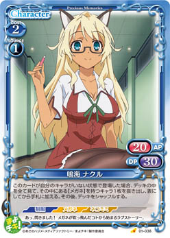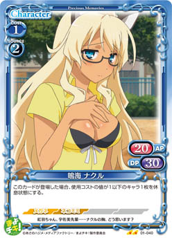 | このカードが自分のキャラがいない状態で登場した場合、デッキの中を全て見て、その中にある【メガネ】を持つキャラ1枚を抜き出し、表にしてから手札に加える。その後、デッキをシャッフルする。 | ||
