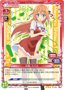 | このカードが退場した場合、デッキの上のカード3枚を見て、その中にある『まよチキ!』のキャラ1枚を抜き出し、表にしてから手札に加える。その後、残りのカードを任意の順番でデッキの下に移す。 | ||