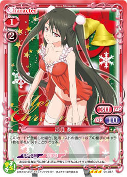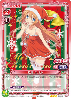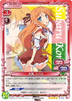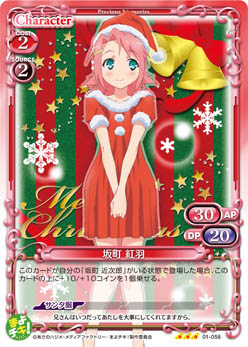 | このカードがアプローチに参加した場合、ターン終了時にカードを1枚引く。このカードは、APとDPの合計値が60以下のキャラに妨害されている場合、退場しない。 | ||