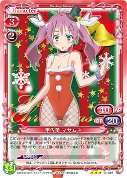 | このカードが登場した場合、このターン、自分が次にプレイする「宇佐美 マサムネ」1枚は、使用コスト-2を得る。 | ||