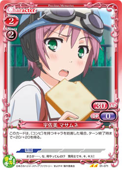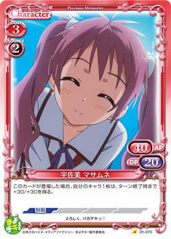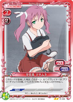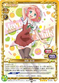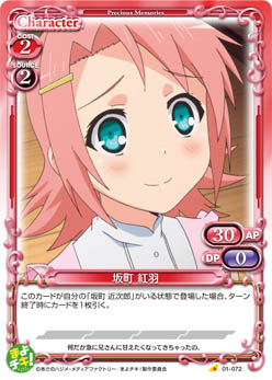 | 〔アクティブ〕このカードがアプローチでポイントを与えた場合、カードを1枚引く。このカードのアプローチで相手のキャラが退場した場合、自分の捨て札置き場にある「坂町 紅羽」1枚を手札に戻すことができる。 | ||