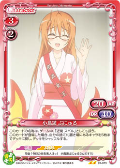 | 〔コンビ〕このカードが登場した場合、デッキの上のカード2枚を表にする。その場合、その中にあるこのカードと同じ特徴を持つ任意の枚数のキャラを手札に加える。 | ||