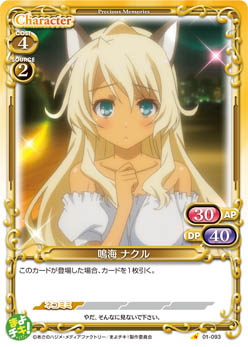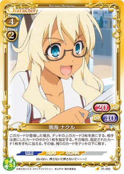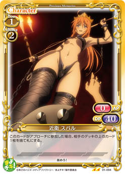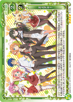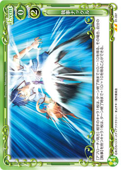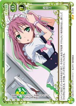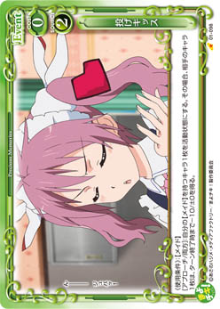 | 《使用条件》:【メイド】[アプローチ/両方]:自分の【メイド】を持つキャラ1枚を活動状態にする。その場合、相手のキャラ1枚は、ターン終了時まで-10/±0を得る。 | ||