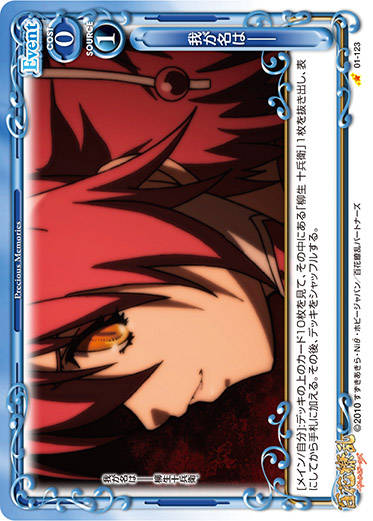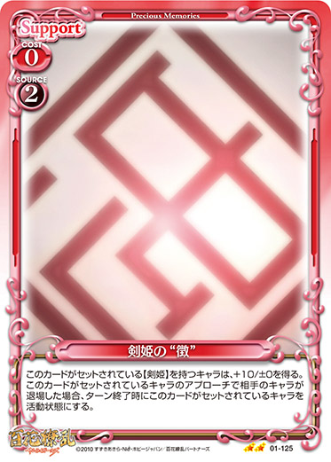 | このカードがセットされている【剣姫】を持つキャラは、+10/±0を得る。このカードがセットされているキャラのアプローチで相手のキャラが退場した場合、ターン終了時にこのカードがセットされているキャラを活動状態にする。 | ||