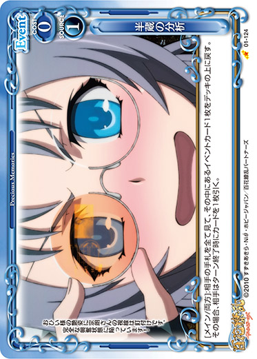 | [メイン/両方]:相手の手札を全て見て、その中にあるイベントカード1枚をデッキの上に戻す。その場合、相手はターン終了時にカードを1枚引く。 | ||