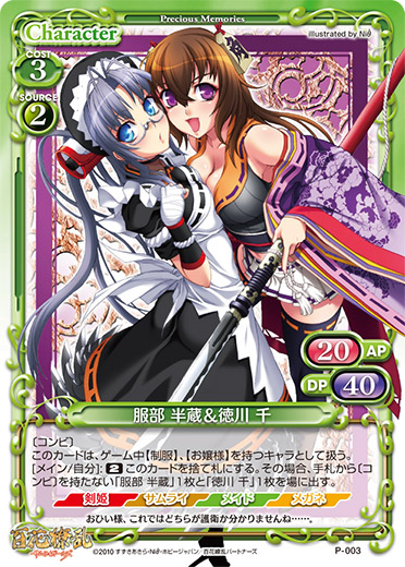 | 〔コンビ〕このカードは、ゲーム中【制服】、【お嬢様】を持つキャラとして扱う。[メイン/自分]:《2》このカードを捨て札にする。その場合、手札から〔コンビ〕を持たない「服部 半蔵」1枚と「徳川 千」1枚を場に出す。 | ||