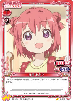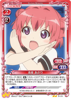 | 〔コンビ〕〔天然2〕このカードがアプローチでポイントを与えた場合、自分の捨て札置き場にある、このカードと同じ名称の自分のキャラの枚数以下の使用コストの値を持つ「吉川 ちなつ」または「赤座 あかり」1枚を場に出す。 | ||