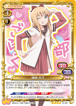 | 自分の全ての【ごらく部】を持つキャラは、〔アクティブ〕を得る。[アプローチ/自分]:《0》このカードとこのカード以外の自分の『ゆるゆり』のキャラ1枚は、ターン終了時まで+10/±0を得る。 | ||