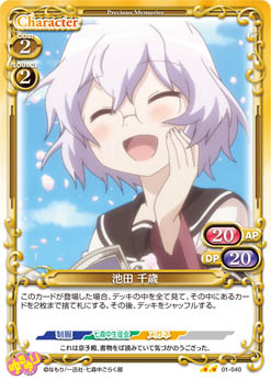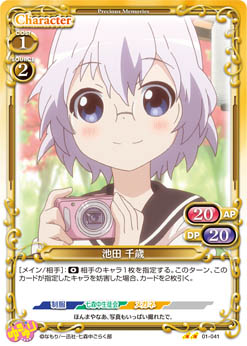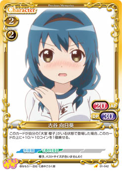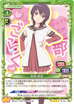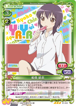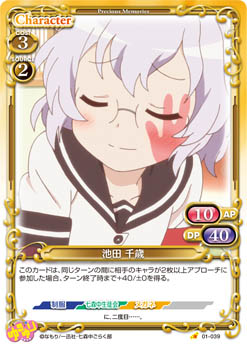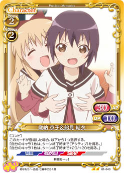 | このカードが退場した場合、自分のポイント置き場にある『ゆるゆり』のキャラ1枚を表向きにすることができる。このカードは、キャラがアプローチまたは妨害に参加するごとに、ターン終了時まで+10/±0を得る。 | ||