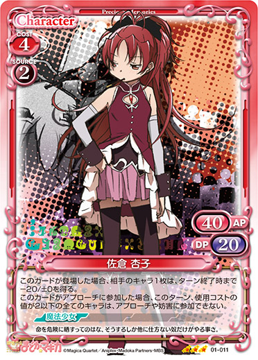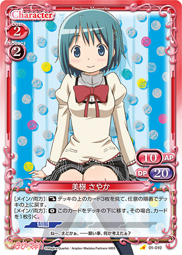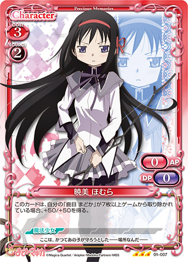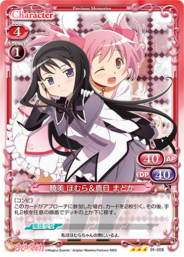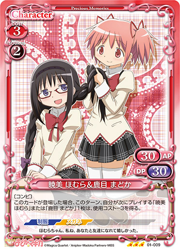 | 〔コンビ〕このカードが登場した場合、このターン、自分が次にプレイする「暁美 ほむら」または「鹿目 まどか」1枚は、使用コスト-3を得る。 | ||