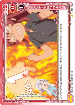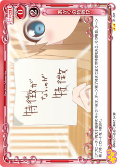| [アプローチ/自分]:自分の「赤座 あかり」を妨害している相手のキャラ1枚は、ターン終了時まで-20/-20を得る。その場合、アプローチに参加している「赤座 あかり」1枚は、ターン終了時まで全ての特徴を失う。 | ||