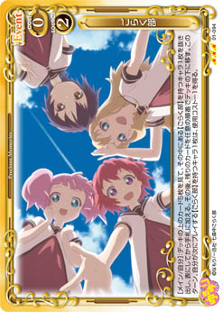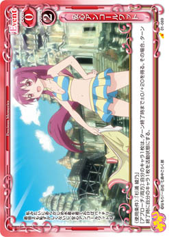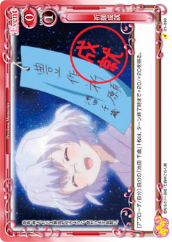 | 《使用条件》:「杉浦 綾乃」[アプローチ/両方]:自分のキャラ1枚は、ターン終了時まで±0/+20を得る。その場合、ターン終了時に自分のキャラ1枚を活動状態にする。 | ||