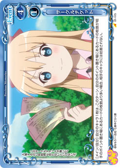 | [メイン/自分]:自分のキャラ1枚は、このターン、自分のポイント置き場にあるカードの枚数が相手のポイント置き場にあるカードの枚数より多い場合、相手のキャラには妨害されない。 | ||