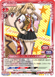 | このカードは、手札にある場合、このカードと同じ特徴を持つ自分のキャラ1枚につき、使用コスト-1を得る。このカードがアプローチまたは妨害に参加している場合、このカード以外の全てのキャラは、-10/-10を得る。 | ||