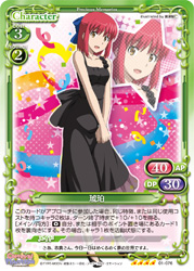 | [メイン/両方]:《0》自分の捨て札置き場にあるキャラ1枚をデッキの下に移す。その場合、そのキャラと同じ名称の自分のキャラ1枚は、ターン終了時まで+10/+10を得る。 | ||