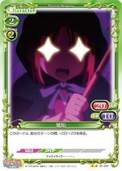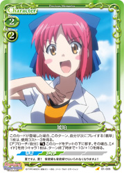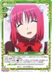 | このカードが登場した場合、このターン、自分が次にプレイする「琥珀」1枚は、使用コスト-3を得る。[アプローチ/相手]:《休》このカードをデッキの下に移す。その場合、【メイド】を持つキャラ1枚は、ターン終了時まで+10/+10を得る。 | ||