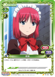 | このカードが登場した場合、このターン、自分が次にプレイする「翡翠」1枚は、使用コスト-3を得る。[アプローチ/自分]:《休》このカードをデッキの下に移す。その場合、【メイド】を持つキャラ1枚は、ターン終了時まで+10/+10を得る。 | ||